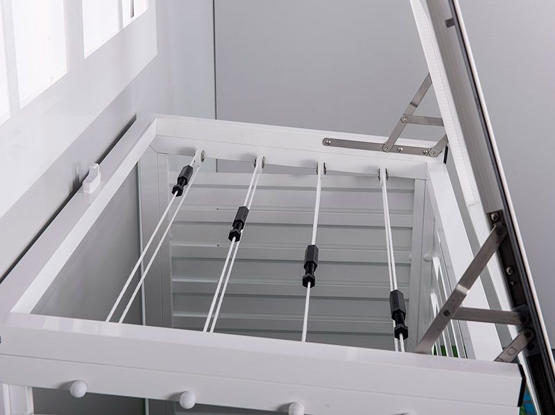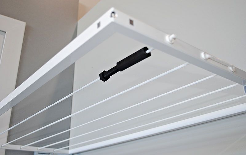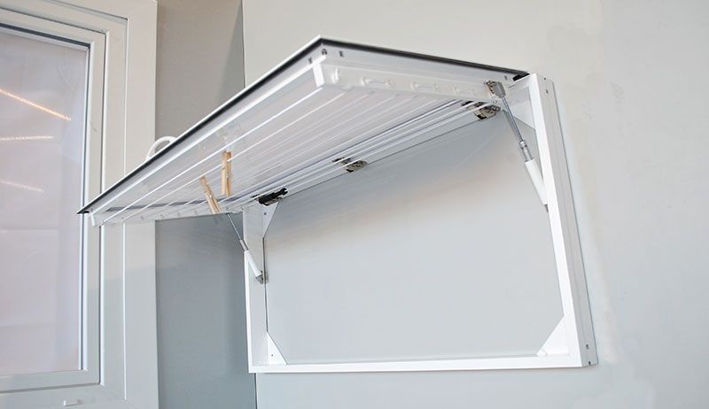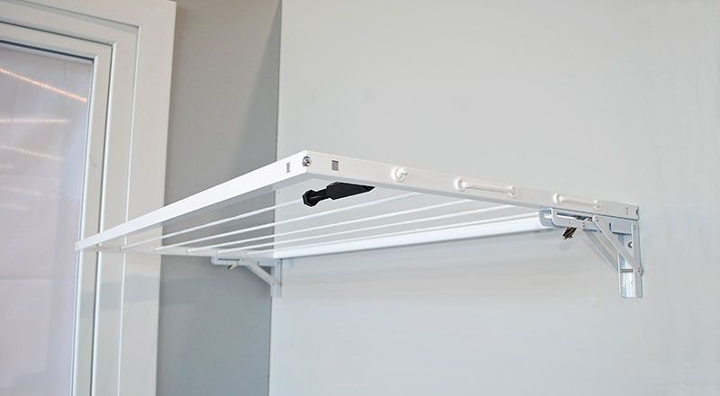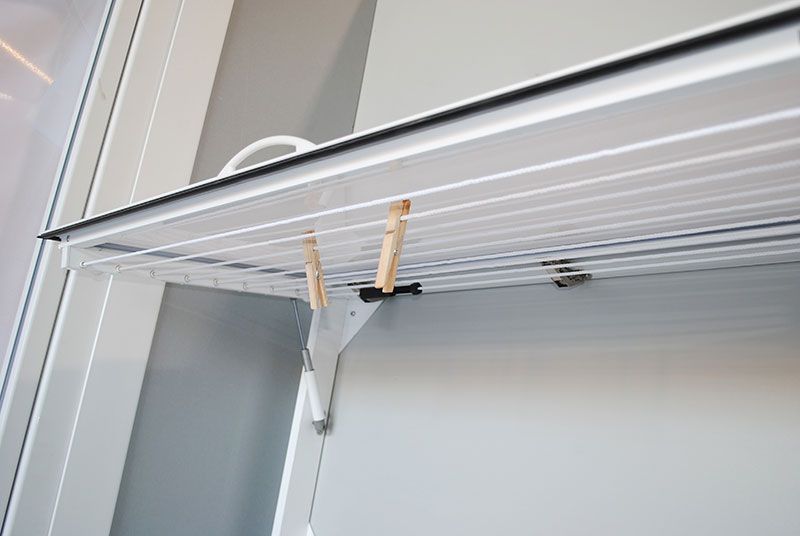 - SIN TAPA. Se trata de un tendedero con cuerdas que se puede plegar hacia la pared cuando no se está usando y se puede elevar cuando ya se ha colocado la ropa en sus cuerdas.